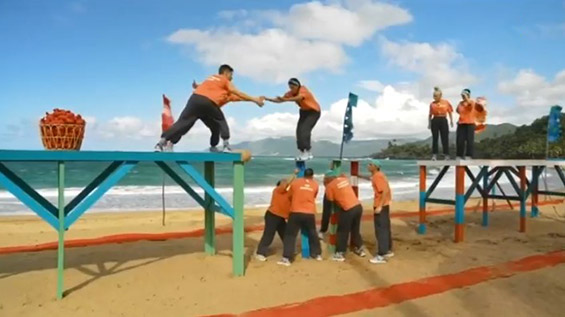 Первое командное испытание будет их ждать прямо при встрече. Им предстоит преодолеть полосу препятствий, переставляя столбы для участников, которые будут сверху. Затем перетащить мешки с песком к месту, где будет катапульта. С помощью катапульты им нужно будет сбить четыре мишени.
